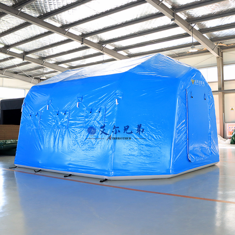 充气帐篷介绍:这款蓝色单层充气帐篷尺寸是5*4.2米,出口韩国。充气帐篷属于帐篷的一种,主要用于防潮、防水、抗风、防尘、防晒、抢险救灾、野外短期训练,野外短期作战等。艾尔兄弟充气帐篷采用结构力学的原理设计框架,利用气体压强特性将气囊膨胀形成具有一定刚性的柱体,经过有机组合撑起帐篷的骨架。随着采用的骨架材料的强力大小,可以设定帐篷的承重大小;采用高分子涂层的性能优劣,决定这框架的使用寿命与框架刚性的维持;而气室设定的合理性,则决定着这个框架的撑起极限。